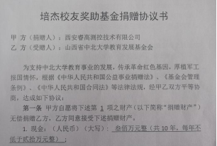 日前,在喜迎学校建校80周年之际,经过中北大学校友办、机电工程学院领导和校友们积极协调,付培杰校友任董事长的西安睿高测控技术有限公司与中北大学教育发展基金会签订了《培杰校友奖助基金捐赠协议书》,计划10年向学院捐赠300万元,用于机电工程学院培杰校友奖助基金资助项目。首笔资金20万元已经到账,这是学院继张志瑾校友捐赠后再次获得百万量级的校友捐赠资金。