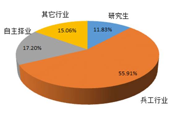另外从2017年毕业学生的就业情况分析,有近56%的学生毕业后直接在兵器行业的工厂、研究所工作,明确跨行业工作的学生占到15.06%,另外17.2%自主择业学生一部分跨行业就业,另外一部分则选择继续复习考取研究生,在2017年近12%的学生直接考取研究所继续深造,考取的主要院校包括中北大学、北京理工大学、南京理工大学、西北工业大学等学校。