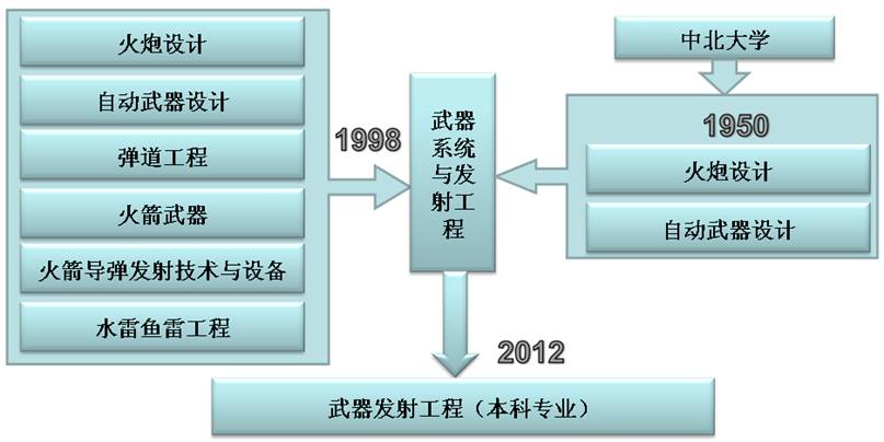 武器发射工程”专业是我国创建最早的军工专业之一,1950年始建于北京工学院,1958年国务院进行院系调整时,整体迁移到太原机械学院(现中北大学)。1998年高等学校本科专业目录调整时由原“火炮设计”、“自动武器设计”、“火箭导弹发射技术与设备”、“火箭武器”、“弹道工程”、与“水雷鱼雷工程(部分)”数个专业合并形成,中北大学在专业合并前有“火炮设计”和“自动武器设计”专业,2012年专业名称由“武器系统与发射工程”调整为“武器发射工程”。