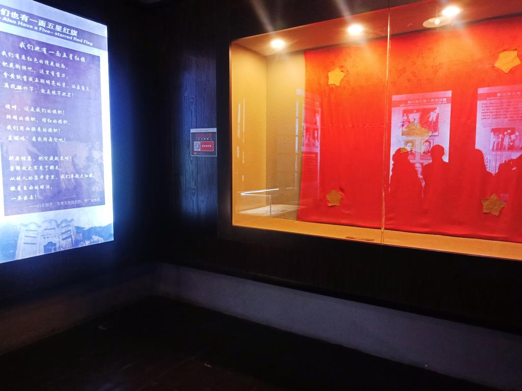 白公馆共分为两层,面对那些令人毛骨悚然的的牢房,读着一个个催人泪下的英雄故事时,大家都真切地感受到革命先烈为了国家兴衰和民族存亡抛头颅、洒热血的革命情怀。走到第二层一间牢房,映入眼帘的便是一面“绣”成的五星红旗,以被面做底,以纸剪成星,一针一线绣成了这面五星红旗。他们即使被关押在暗无天日的牢狱,但他们仍渴望着五星红旗能高高的飘扬在中国上空。这盛世,如您所愿。