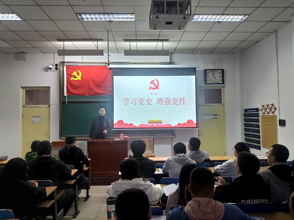 大会开始,由支部书记刘光同志为大家讲解党史及学习党史的意义。通过此次党史学习教育,使党员学生们深入了解党领导人民革命、建设、改革的历史,从党的伟大历程和辉煌成就中汲取动力,从党的优良传统和优良作风中汲取营养,从党的历史经验与教训中汲取智慧,对于坚定理想信念,增强宗旨意识,加强党性修养,弘扬优良作风,使党史学习教育真正取得实效,具有重要的现实意义。
