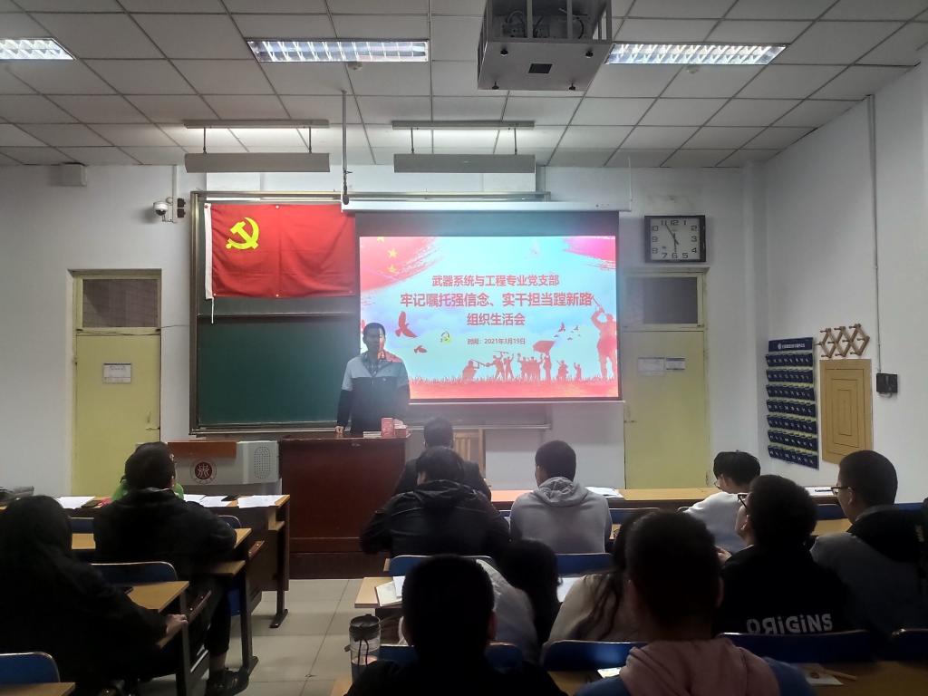 2021年03月19日下午16点整,机电工程学院武器系统与工程专业党支部在11307H开展了“牢记嘱托强信念、实干担当蹚新路”的专题组织生活会暨民主评议党员大会。支委班子和全体党员围绕会议主题,深入检讨了自身存在的问题和不足,严肃开展了批评和自我批评。本次会议由本支部副书记赵然廷同志主持,出席会议的有支部书记刘光同志、邢培岩同志,支部全体学生党员和预备党员。