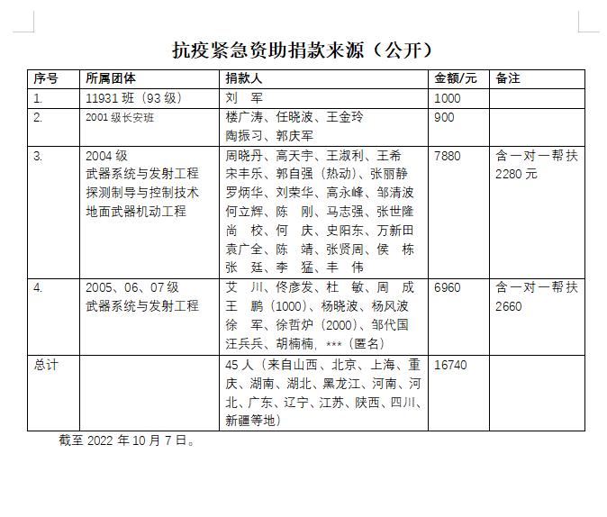 2022年10月2日,我校正在开展第二批返校工作,“太原发布”尖草坪区实施静默管理,何庆、周晓丹、马志强、郭庆军等学院毕业校友第一时间联系院党委副书记刘光及其他老师,了解符合返校条件但因疫情变化滞留在太原的学生情况,并与学院相关学生工作人员密切沟通,迅速统计摸排了学生信息,编制了“抗疫帮扶紧急捐助倡议书”及资助方法,成立了捐款联系工作组,从10月5日至10月7日3天时间完成了约1.7万的捐款,直接资助25名学生,到账约1.3万元。捐款来自13省和3直辖市共45名热心校友。