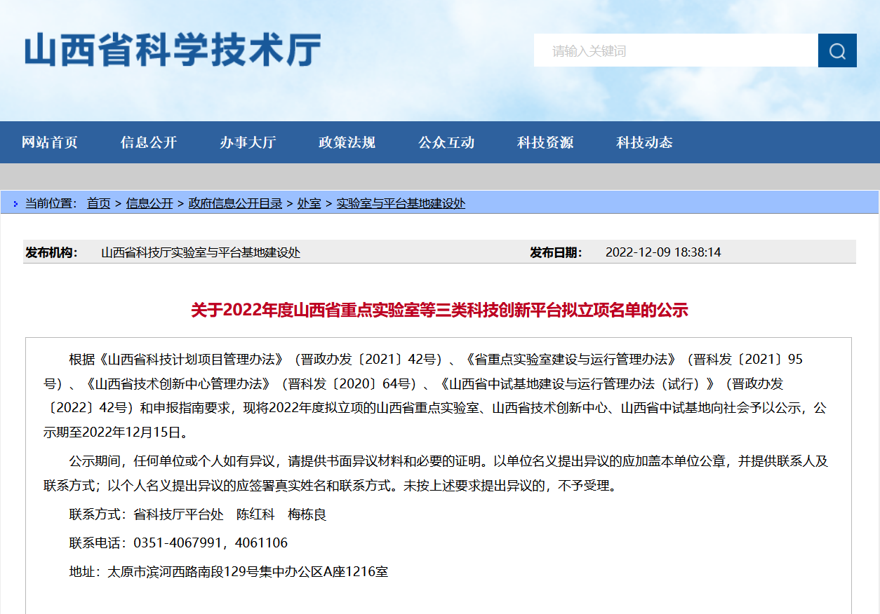 根据《山西省科技计划项目管理办法》(晋政办发〔2021〕42号)、《省重点实验室建设与运行管理办法》(晋科发〔2021〕95号)、《山西省技术创新中心管理办法》(晋科发〔2020〕64号)、《山西省中试基地建设与运行管理办法(试行)》(晋政办发〔2022〕42号)和申报指南要求,现将2022年度拟立项的山西省重点实验室、山西省技术创新中心、山西省中试基地向社会予以公示,公示期至2022年12月15日。