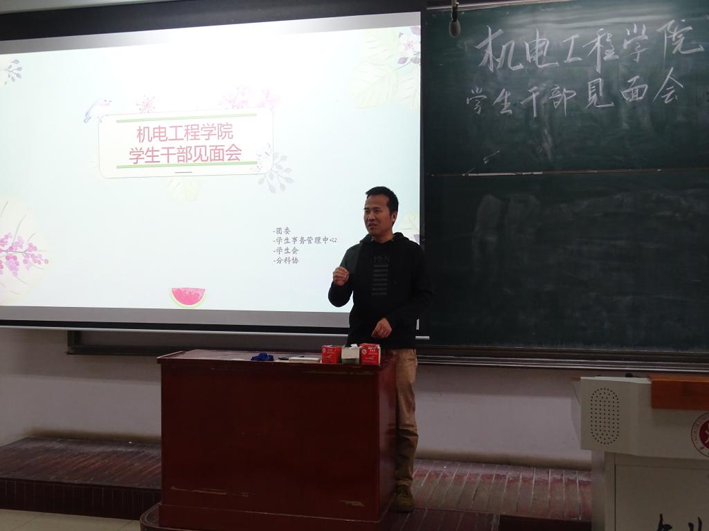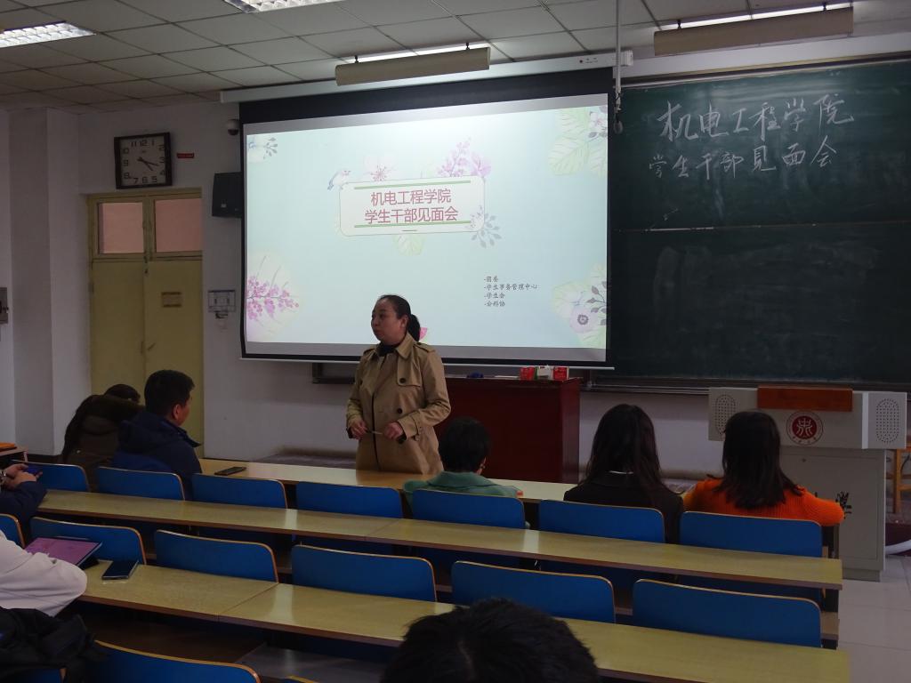 为强化学院学生骨干队伍建设,提升学生干部的综合素质,2023年2月28日下午16点,机电工程学院于11212H举行了学生骨干工作会议。出席本次会议的有机电工程学院党委副书记刘光、院团委书记李晶晶老师,辅导员邢培岩老师、刘凯琼老师、常学芳老师、王永文老师、贺婧老师,张悦老师,以及全体学生骨干。