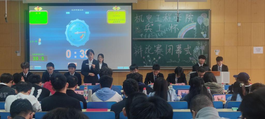 为进一步提高我院学生的语言表达与逻辑思维能力,丰富学生的课余生活,机电工程学院于2023年3月19日下午在11109教室举办了第十七届“兵工杯”辩论赛,在抖音号(勤学日新机电人)进行了全程直播。辅导员老师邢培岩对辩论赛进行指导。
