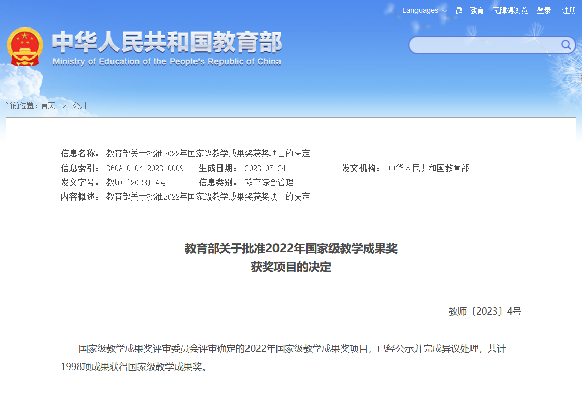 国家级教学成果奖是国家在教学研究和实践领域中颁授的最高奖项,是国务院确定的国家级奖励,每四年评选一次,是与国家自然科学奖、国家技术发明奖、国家科技进步奖并列的国家级奖项。高等教育国家级教学成果奖是国家实施科教兴国战略、人才强国战略和落实立德树人根本任务的重要举措,是对学校人才培养工作和教育教学改革成果的检阅和展示,代表了目前我国高等教育教学工作的最高水平。
