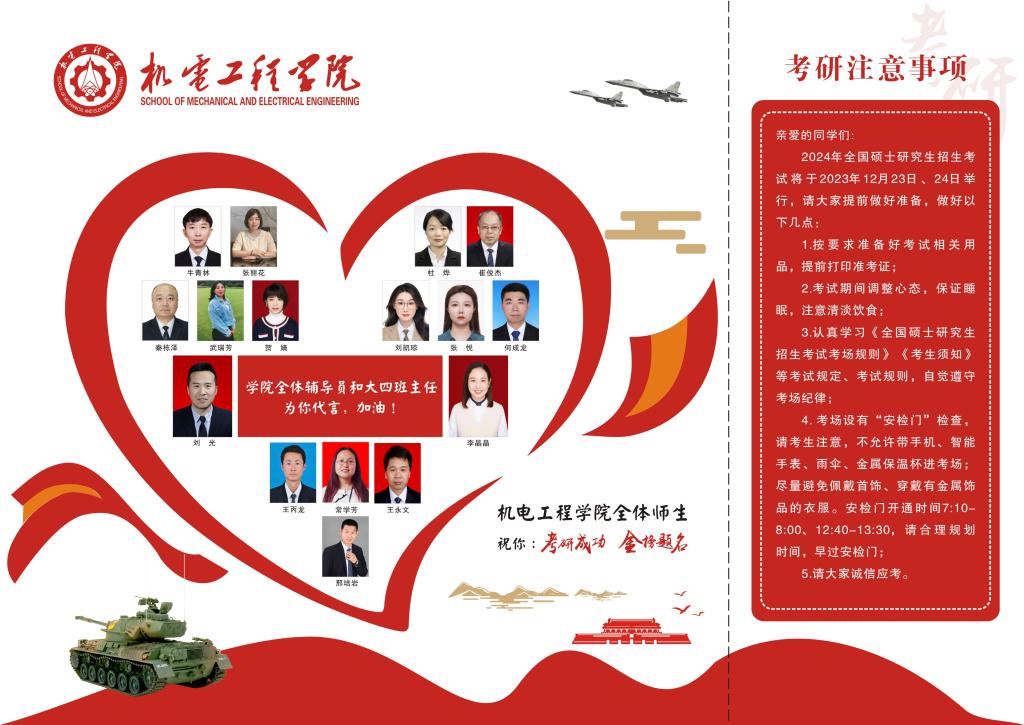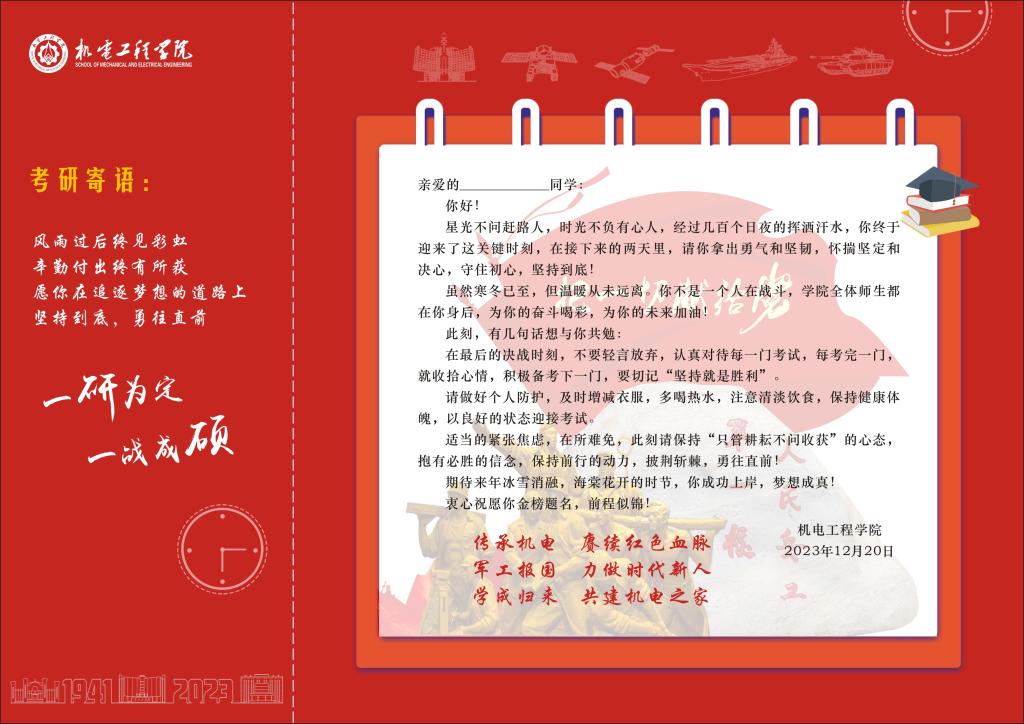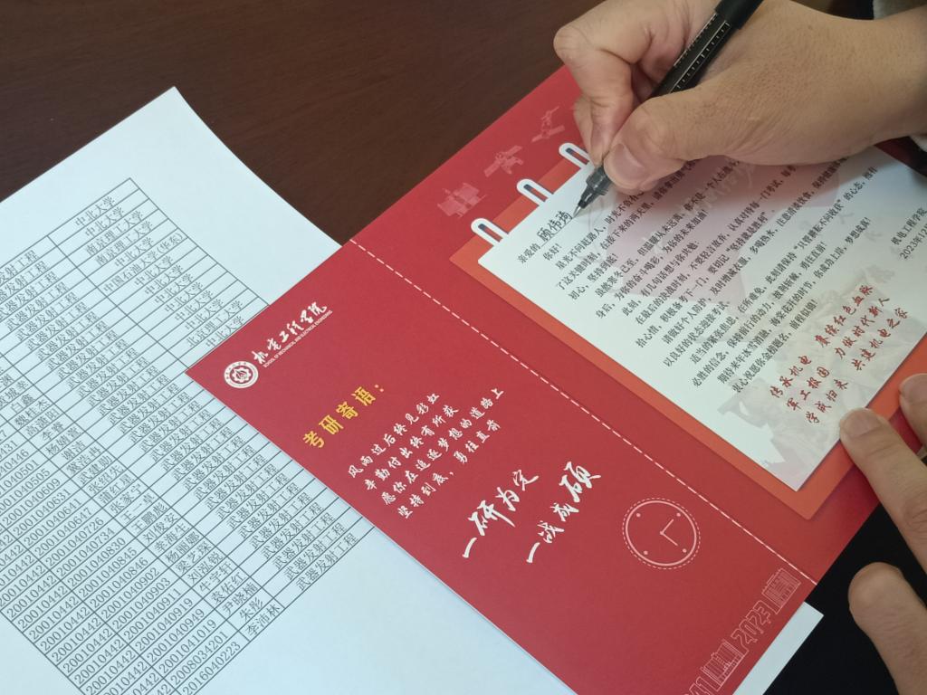 2024年全国硕士研究生招生考试在即,为表达对同学们的关怀鼓励和美好祝愿,为同学们顺利考研保驾护航,机电工程学院于2023年12月21日在文瀛17号宿舍楼为备战考研的同学们送去了意义非凡的祝福卡和考研文具包。祝福卡精心设计并由学院领导带领全体辅导员和毕业班班主任亲手签署,文具包包含中性笔、涂卡笔、橡皮、小刀、胶棒、尺子和档案袋等考试用具,充分表示了学院对考研学子的深度关怀和美好祝愿。