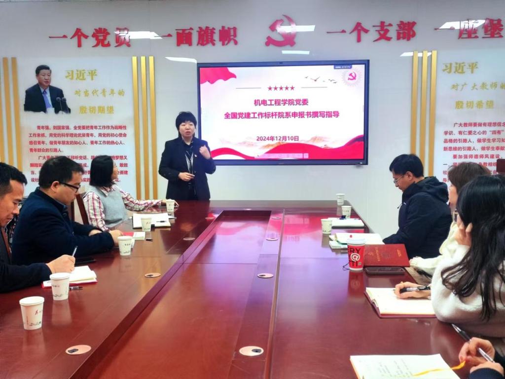 2024年12月11日上午8:30,机电工程学院在科学楼A座党员之家开展了全国党建工作标杆院系申报书撰写指导活动,特邀全国第四批标杆院系仪器与电子学院党委书记郝晓剑作为主讲嘉宾,为机电工程学院分享如何申报建立标杆院系及样板支部。机电工程学院党委书记赵永娟、党委副书记刘光、教工党支部书记及全体支委、学生党支部书记及副书记均到场参加。
