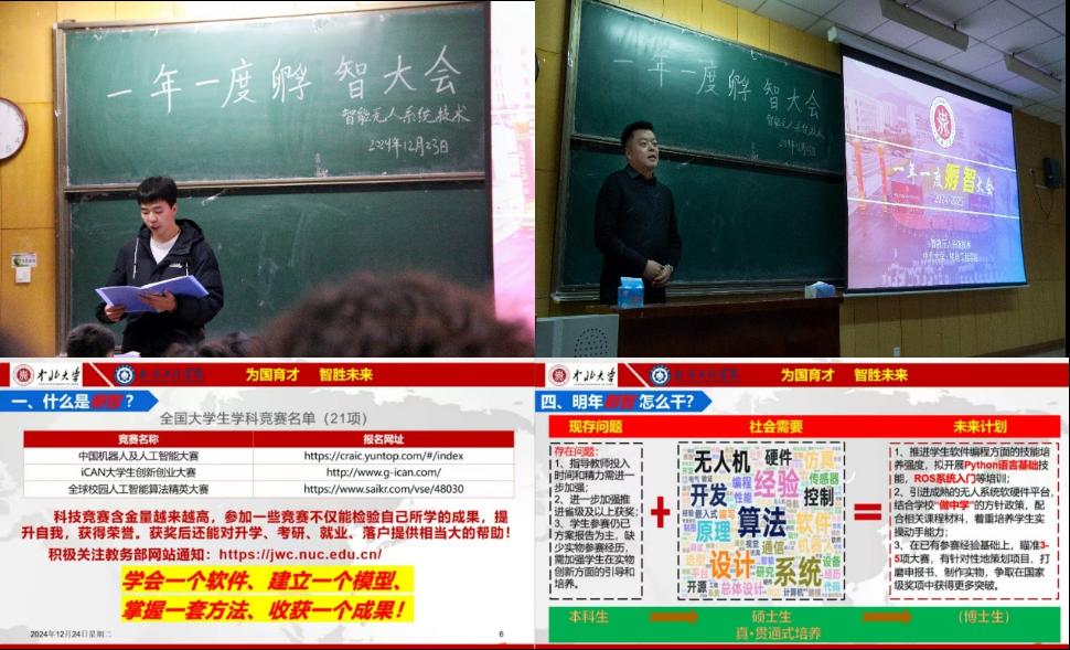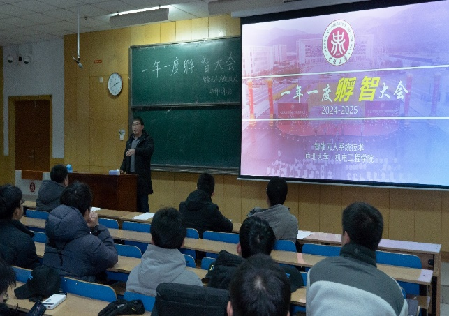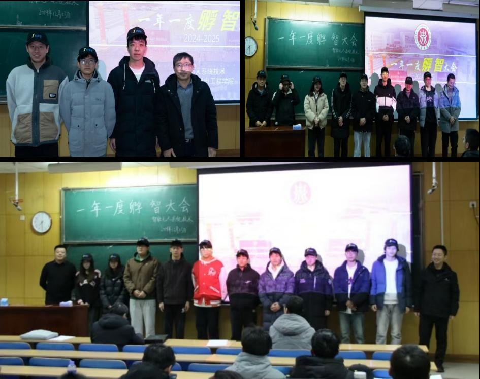 2024年12月23日晚7点,2024年智能无人系统技术专业本科生双创成果总结会暨“一年一度孵智大会”在11108教室举行。机电工程学院李世中副院长、王丙龙老师、沈剑老师、高立阳老师出席了大会。会议由本专业2023级本科生杨德成同学主持。