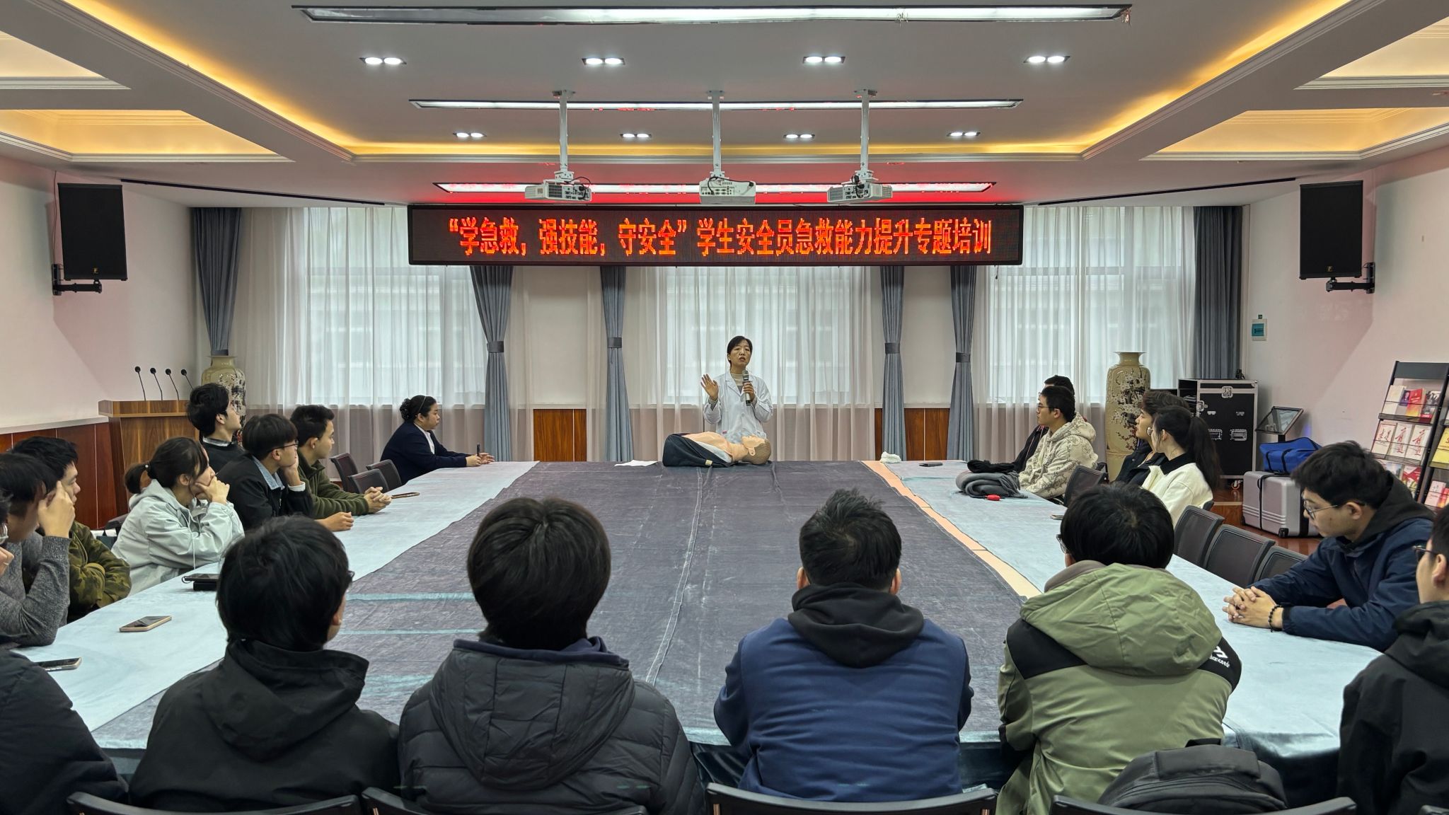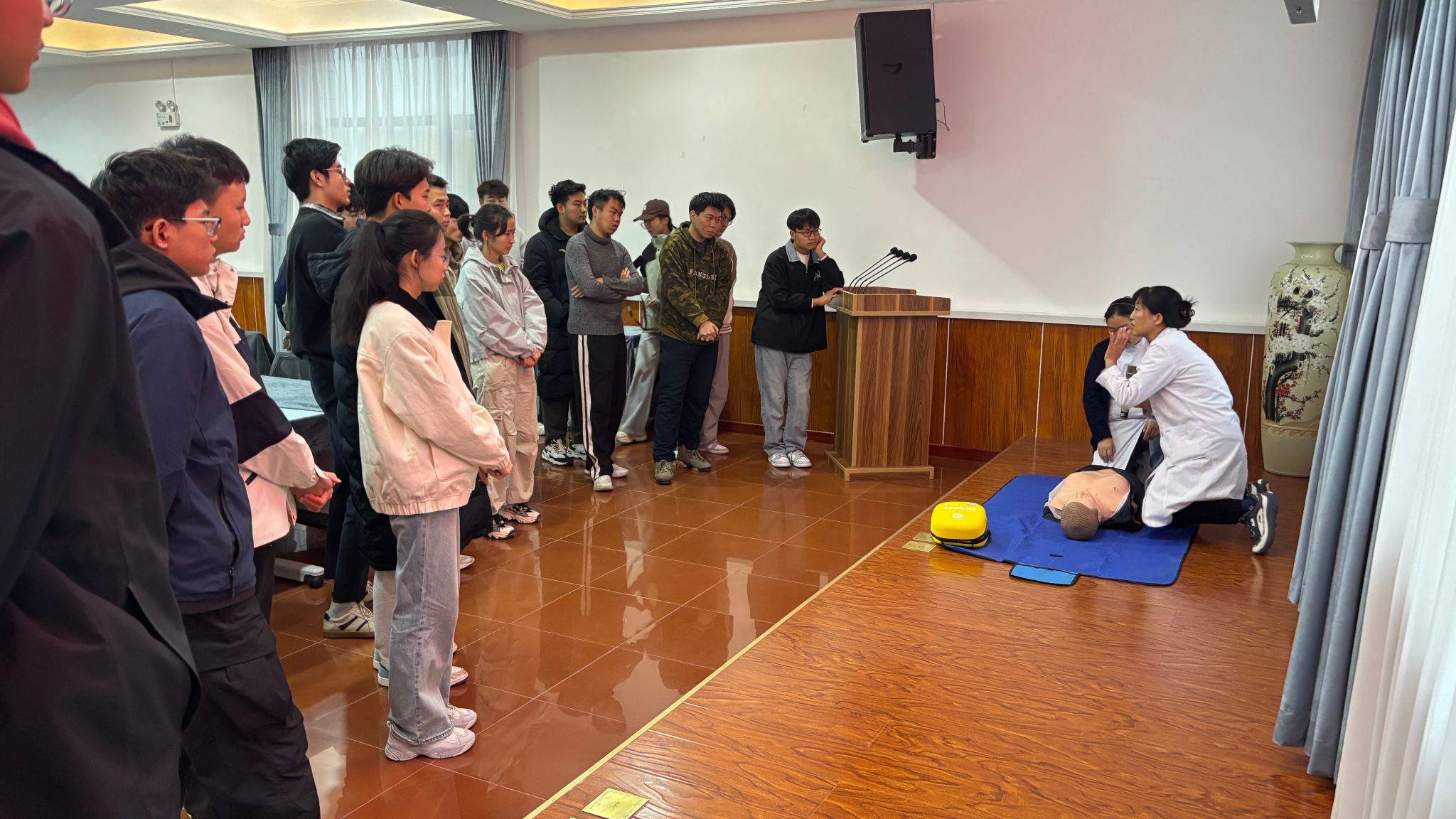 2025年10月14日至11月26日,机电工程学院开展“学急救,强技能,守安全”学生安全员急救能力提升专题培训。此次培训前后共六期,共培训134名安全员。期间多名医生现场实操教育与指导,他们结合多年来临床经验与真实案例,详细讲解了心肺复苏的适用场景、操作步骤及关键要点,从判断意识与呼吸、摆放正确体位,到胸外按压的深度和频率、人工呼吸的规范方法,均进行了逐一拆解。