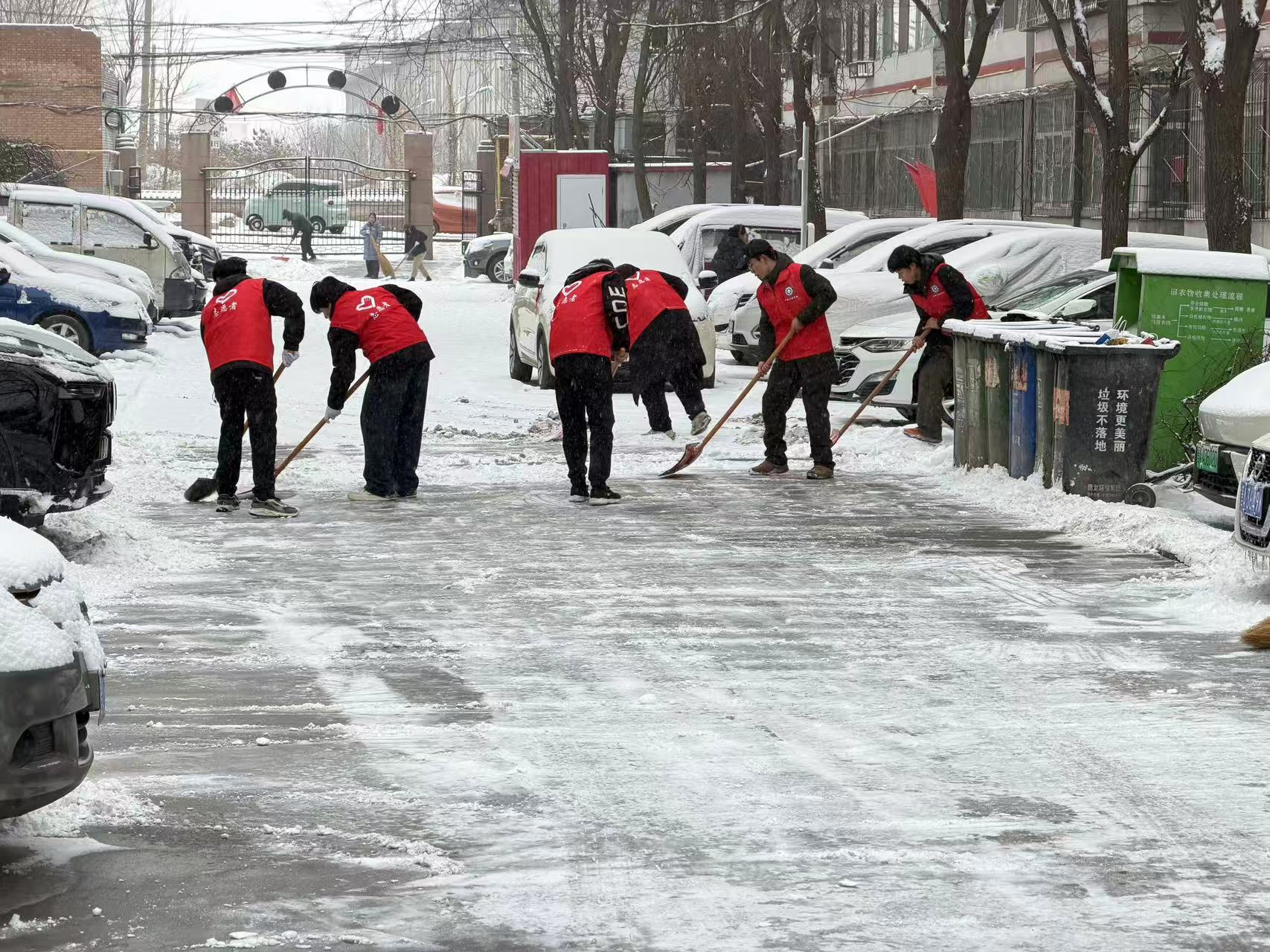 现场志愿者们分工明确、配合默契,有的奋力破除路面坚冰,有的仔细清扫零散积雪,有的合力搬运堆积雪堆,还主动为社区独居老人、行动不便居民清理家门口积雪,并耐心叮嘱出行安全注意事项。尽管双手冻得通红,大家却毫无怨言,始终保持高昂干劲,从清晨到傍晚,成功清理社区主要通行路段积雪,为居民打通了安全出行“绿色通道”。