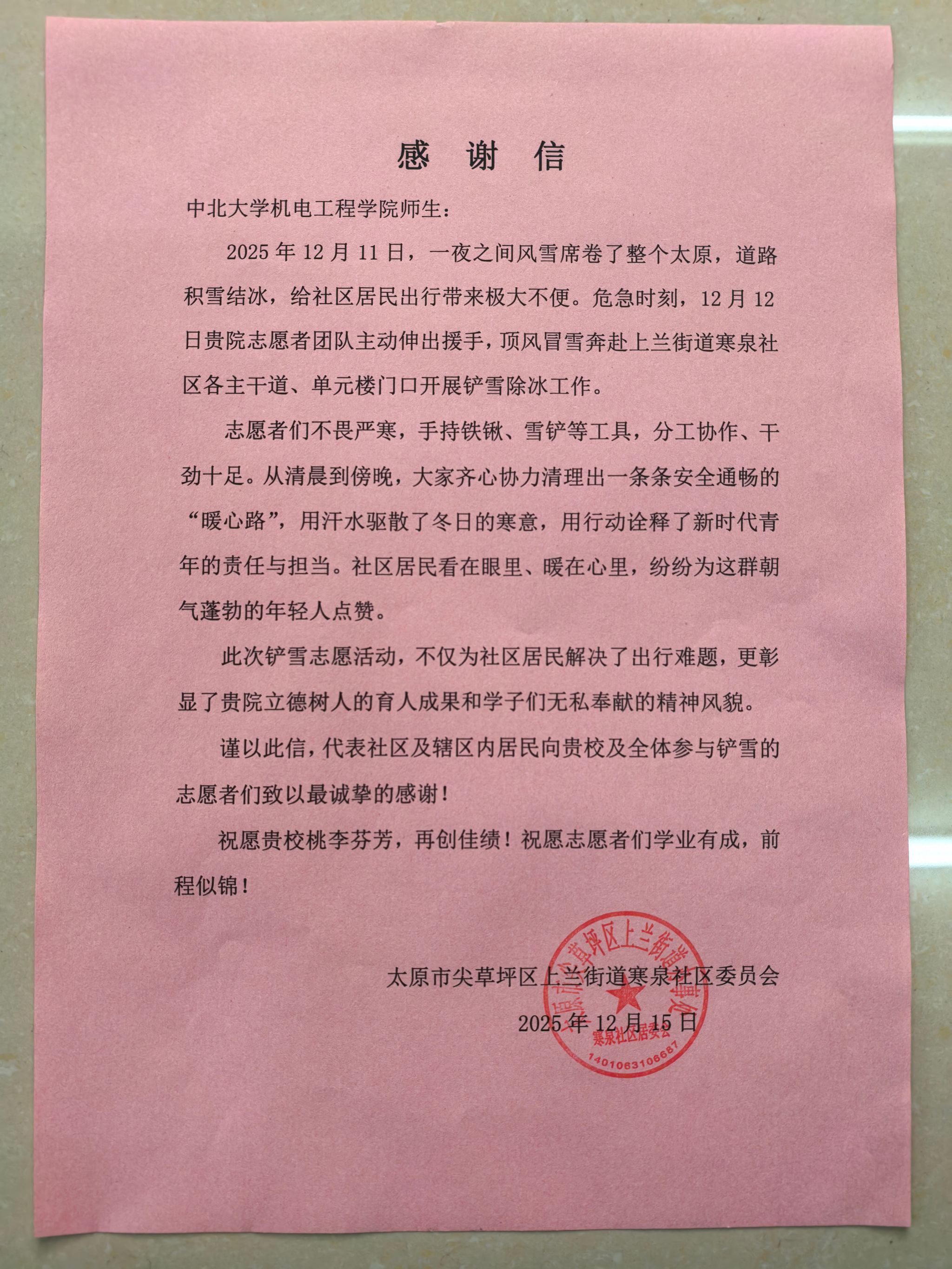 2025年12月12日,太原市遭遇强降雪天气,太原市尖草坪区上兰街道寒泉社区内积雪结冰严重,给居民出行带来极大安全隐患,社区清雪工作压力陡增。中北大学机电工程学院学子主动请缨,组建志愿服务队投身社区除雪一线,以实际行动践行志愿精神,赢得居民广泛赞誉,寒泉社区专门向学院发来感谢信。