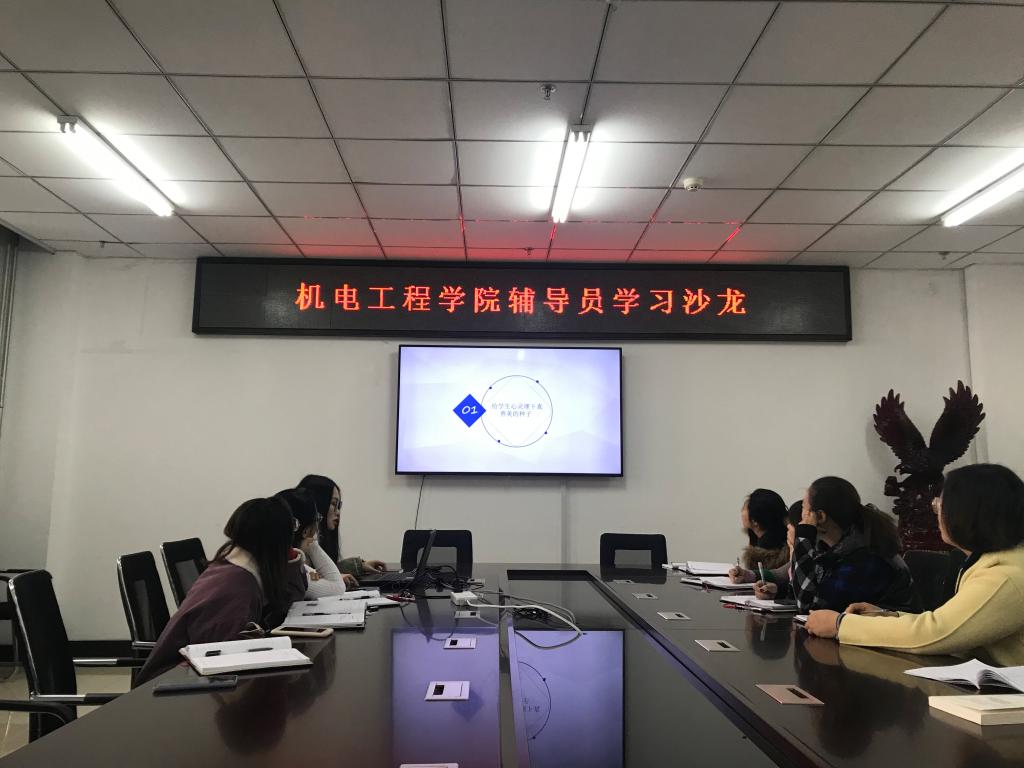 为了提升辅导员素质、促进新老辅导员交流,机电工程学院于2019年11月14日在科学楼A座313举办了辅导员沙龙。本次学习沙龙由院党委副书记刘光主持,学生科科长张丽花、团委书记李晶晶以及全体学生科老师都参加了本次学习。