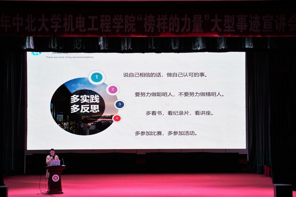 榜样能使我们坚定未来的航向;榜样能使我们产生一股向前的勇气;榜样能使我们找到一片未来的希望。希望本次“榜样的力量”能让2019级学生能认识到自身的不足,在今后的学习生活中戒骄戒躁,以优秀的学长学姐为榜样,勤奋刻苦,努力学习,为中北注入新鲜的血液,努力实现机电梦,中北梦。