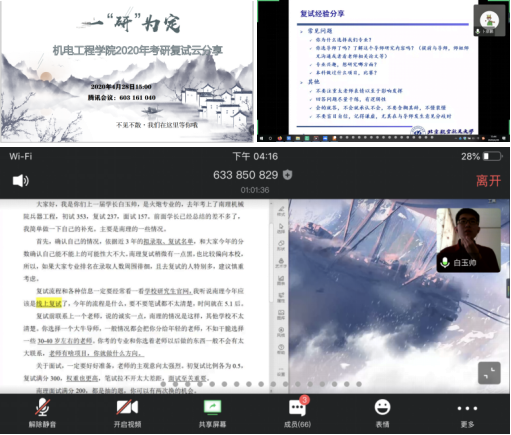 4月28日下午3点,机电工程学院通过腾讯会议平台举办了以一“研”为定为主题的2020年考研复试云分享会,此次分享会由学院负责就业的段老师主持,邀请到了2019年参加研究生复试的四名学长主讲,并有60多名在校生聆听了这次分享会。