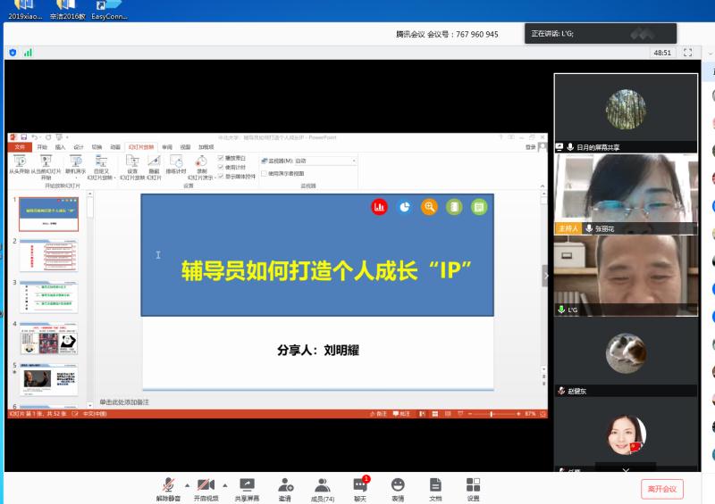 2020年5月27日晚7点,中北大学研学知行辅导员工作室借助腾讯会议平台召开了第七期思政论坛之如何打造辅导员的个人IP云讲座。本次论坛由工作室负责人张丽花主持,中北大学学工部部长李俊华老师、其他学院的党委副书记、校内外82名辅导员参加了此次云上论坛。
