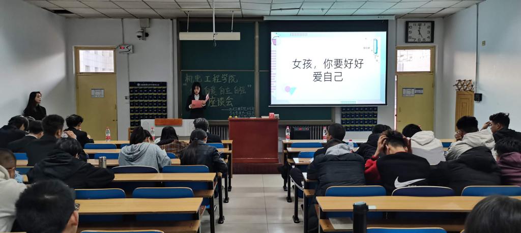 11月3日下午,由机电工程学院女生部、机电工程学院文艺部、学生管理中心启菲源共同主办的关于“自尊自爱 自立自强”主题的座谈会顺利举办并圆满结束。本次讲座不仅为我校女大学生的成长进行指导,也帮助其树立正确的人生观、价值观、恋爱观,提高她们保护自我意识和能力,有利于她们健康成长,对营造良好的校园安全文化氛围起到积极作用。辅导员邢培岩老师参加了此次座谈会。