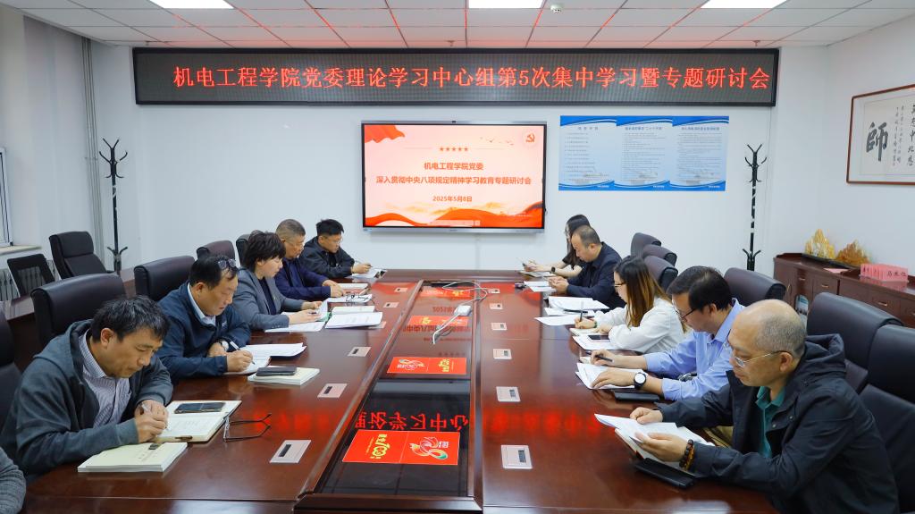为深入贯彻中央八项规定精神学习教育,深入查摆问题,5月8日机电工程学院党委在科学楼A座313会议室开展党委理论学习中心组2025年第5次集中学习。院领导班子、院党委委员、各党支部书记参加,会议由院党委书记赵永娟同志主持。