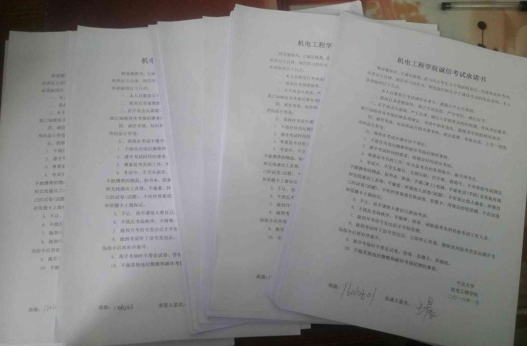 学院党委副书记刘光在班主任例会中向各班主任强调,要在班级内部开展考前动员大会,强调考风考纪的重要性,要求学生认真阅读学生手册中《中北大学本科生考试违纪处分规定》,熟悉违规违纪处分结果,达到威慑作用。同时大一、大二全体学生签署《机电工程学院诚信考试承诺书》,承诺考试中严格遵守考场纪律、诚信应考,坚决杜绝抄袭、偷看等舞弊行为。