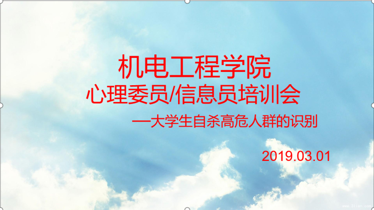 同窗四年,韶华漫天,青春芳华的我们,是否留意到身边的“花自凋零”,机电工程学院2019年3月1日中午一点于11106H教室召开本学期第一次心理委员、心理信息员培训会,旨在安排本学期重点工作,同时加强对大学生自杀高危人群的识别和研判,最大限度减少极端事件的发生。
