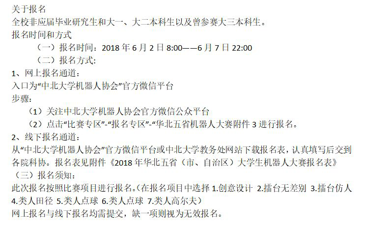 “心中有梦,眼中有光,脚下有路”无非是我们青年大学生最好的状态。身为肩负未来祖国重任的一代,我们应有着蓬勃的创新思想和勇于实践的实干能力。为此,经校教务处、校团委和中北大学机器人创新平台研究决定,面向全校开展“2018年华北五省(市、自治区)大学生机器人大赛”的报名工作。