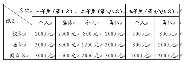 学生单项奖学金根据竞赛级别给予相应奖励,奖励金额: