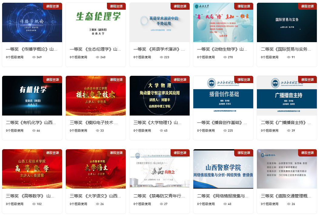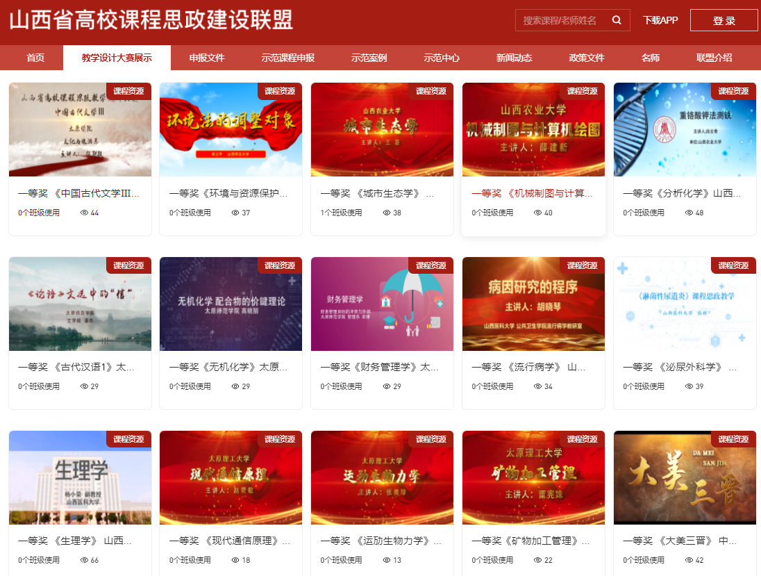 建设了山西省高校课程思政教学资源共享平台(https://sxukcsz.yuketang.cn/pro/portal/page/sbwj) ,依照模块化建设标准。设有“示范案例”“示范课程”“示范中心”“教学名师和团队”“教学设计大赛”等栏目,将全省高校课程思政资源和省外高校优质课程思政资源上传网络共享平台,实现课程思政建设信息化、网络化、数字化,极大方便了全省高校教师获取优质课程思政资源。