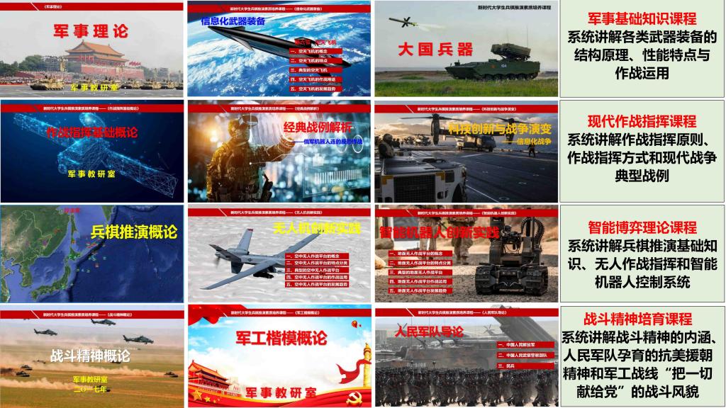 面向新时代国防现代化建设对新型军事人才知识结构的需求,依托国防特色学科专业、教育部“大思政课”实践教学基地等大平台资源从“军事基础知识、现代作战指挥、智能博弈理论和战斗精神培育”四个维度,构建了由 12 门课程组成的兵棋推演素质培养课程群,支撑打牢兵棋推演人才的知识功底。