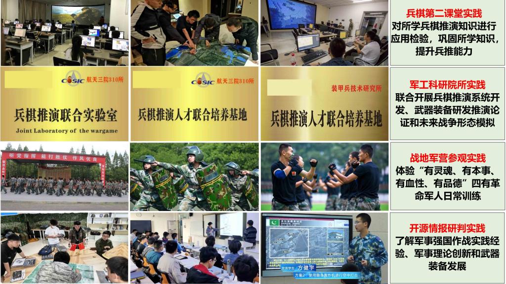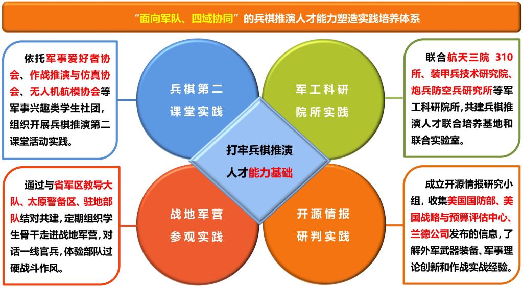 聚焦建设世界一流军队战略目标,从“兵棋第二课堂实践、军工科研院所实践、战地军营参观实践和开源情报研判实践”四个领域,构建兵棋推演人才多元化实践培养体系,协同打牢兵棋推演人才的能力基础。